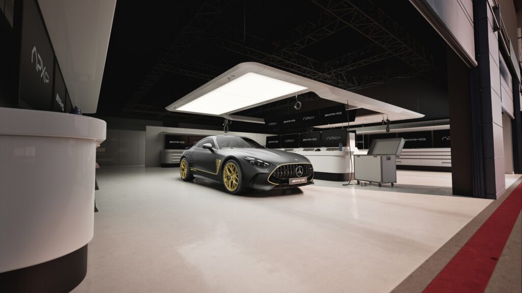 O visual do AMG GT APXGP Edition foi inspirado na equipe fictícia do filme. A pintura exclusiva traz detalhes manuais como o tom dourado “Race Gold” na grade dianteira, para-lamas, saias laterais e difusor traseiro. O modelo também conta com rodas forjadas AMG de 21 polegadas em dourado fosco e freios cerâmicos de alto desempenho com pinças pretas.